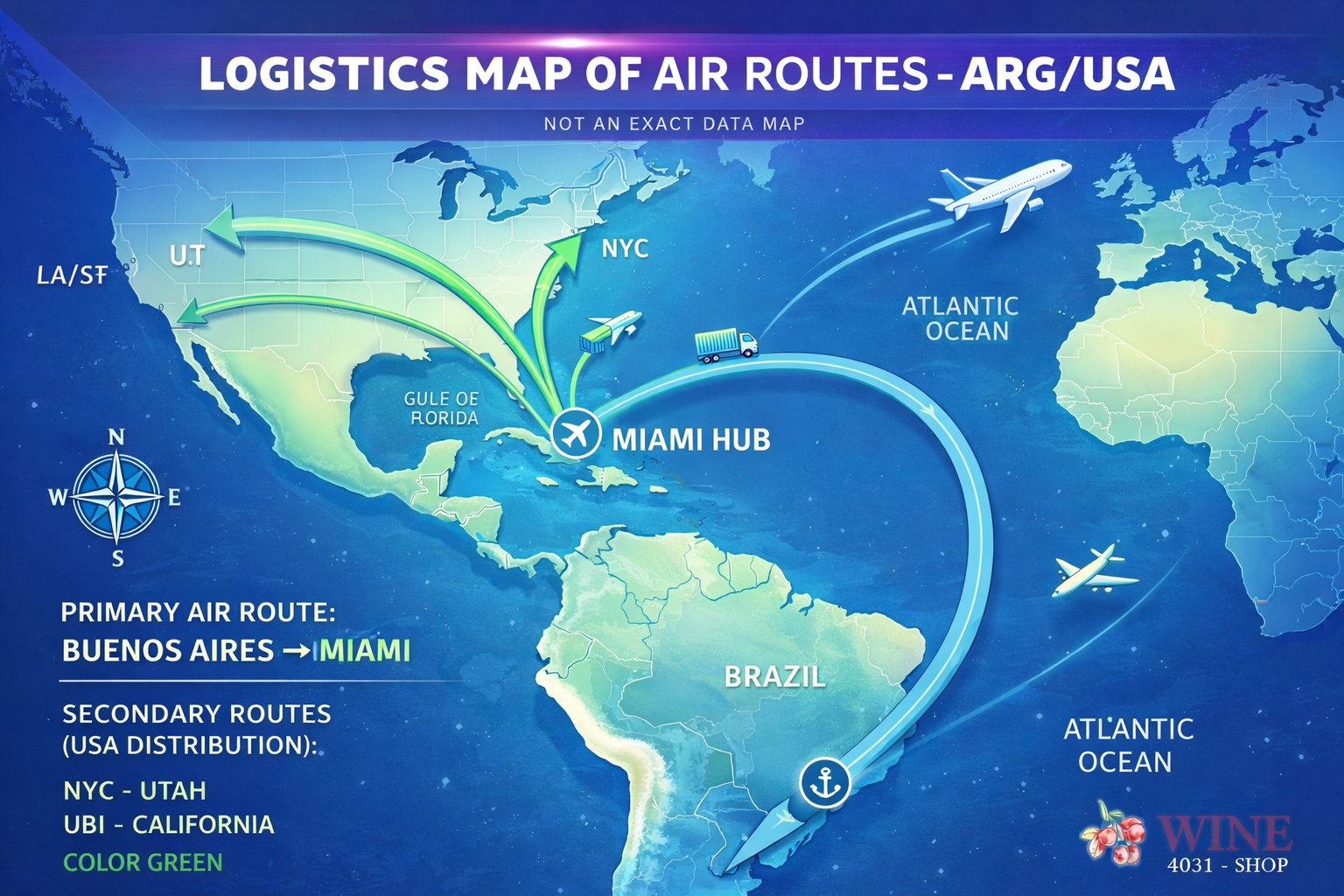 This map represents our export logistics network for Argentine wines. Wines depart from Buenos Aires and arrive in Miami, our main logistics hub. From Miami, shipments are distributed across all U.S. states through our domestic logistics network. The hub also supports international distribution, including exports to Europe.